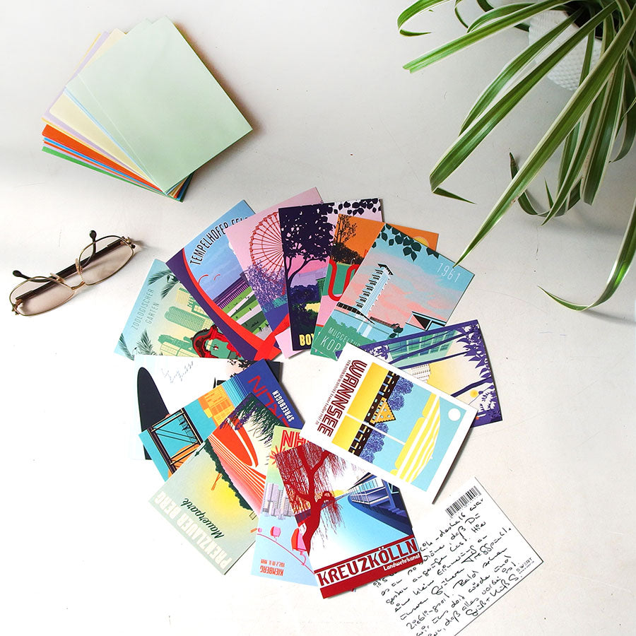 Die Grafikpostkarten im Retro-Look sind eine Hommage an besonders Orte und Kieze in Berlin. Mit unseren Berlin Postkarten kann man bildschöne Grüsse aus Berlin verschicken. Kotti, Bierpinsel, Gasometer und Humboldthain aber auch touristische Highlights wie Berliner Fernsehturm oder der Berliner Zoo sind aufs Schönste illustriert. Auch als Wanddeko machen die Karten eine gute Figur - im passenden Dina A6 Rahmen oder als Collage mit Pins, Klemmen oder Magneten.