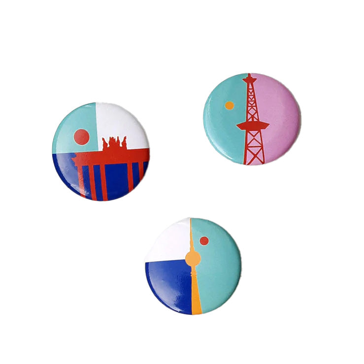 Entdecke unsere Berlin Buttons mit den ikonischen Wahrzeichen der Hauptstadt: Fernsehturm, Brandenburger Tor, Berliner Bär und Funkturm.