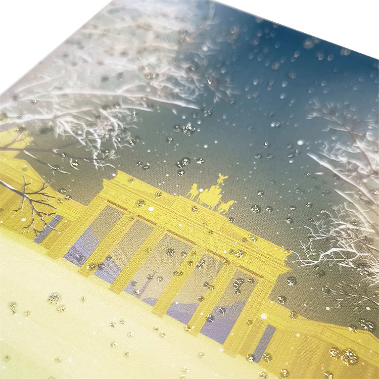 Erinnern Sie sich an die magische Atmosphäre, wenn die Lichter der Stadt im Winter leuchten? Diese Postkarte fängt genau diesen Moment ein. Mit dem Brandenburger Tor als majestätischem Wahrzeichen, umgeben vom Winterzauber, ist sie das perfekte Andenken an Ihre Reise nach Berlin.