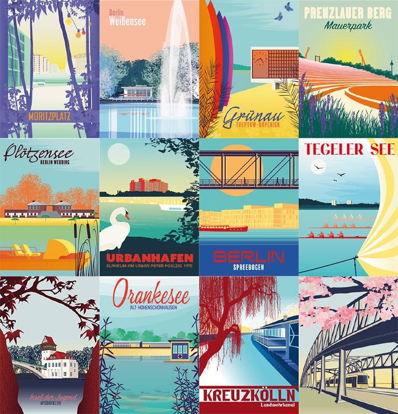 Postcard set with twelve illustrations of beautiful parks, lakes and squares in Berlin.