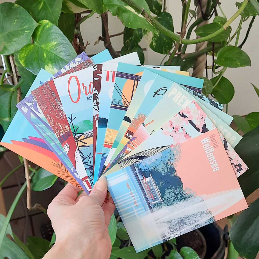 We now have postcard sets with illustrations for different cities and regions in our program. Munich, Basel, Frankfurt and Black Forest. There are several sets for Berlin. Because this is where we live and work.