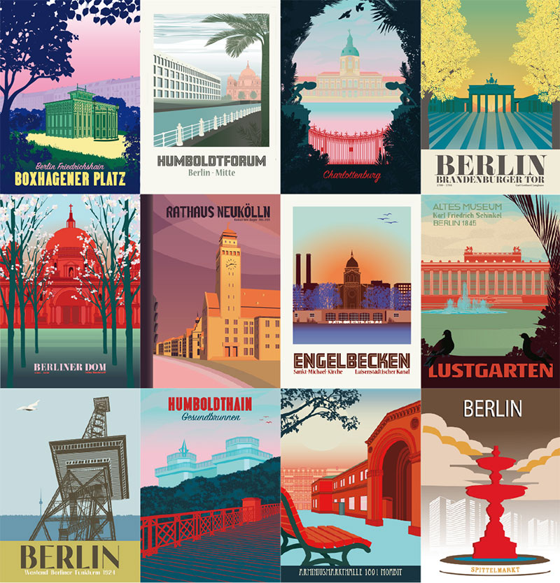 We now have postcard sets with illustrations for different cities and regions in our program. Munich, Basel, Frankfurt and Black Forest. There are several sets for Berlin. Because this is where we live and work.