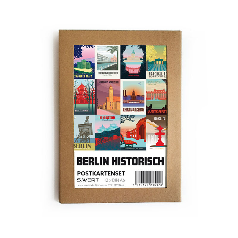 Postcard set with twelve colorful illustrations of historic buildings and squares in Berlin. There are 12 postcards for the price of 10. Included are the Funkturm, the Altes Museum, the Humboldtforum, Charlottenburg Palace and more.