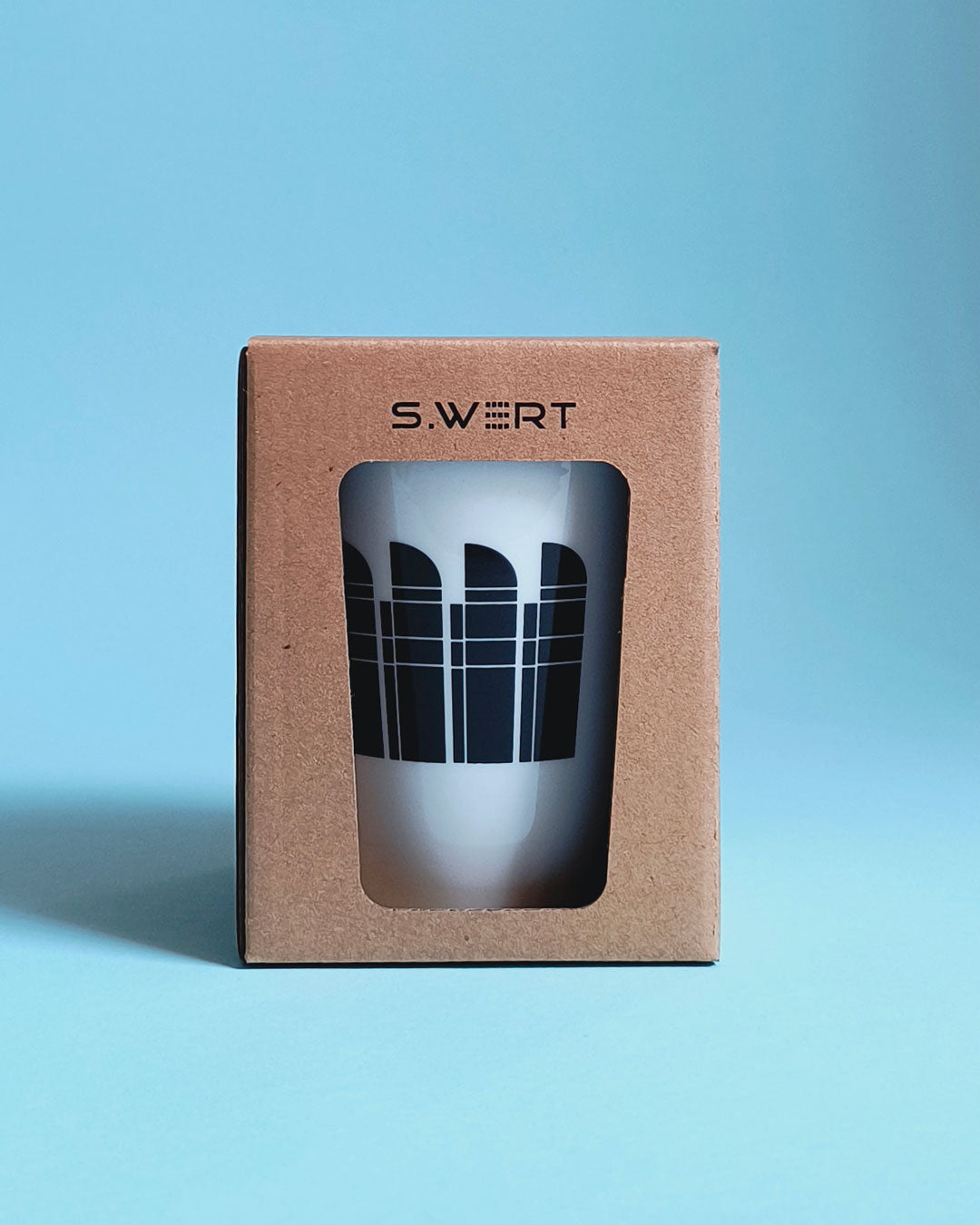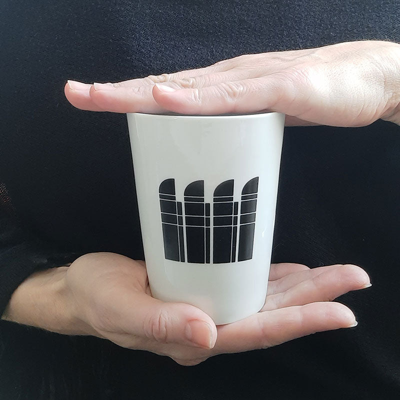 Das Design des Bechers ist von der beeindruckenden Architektur und der modernen Ästhetik des Berliner Bauhaus-Archivs inspiriert. Die schwarz-weiße Grafik zeigt die markanten Linien und Formen des Gebäudes und verleiht dem Becher ein zeitloses und doch ansprechendes Aussehen.
