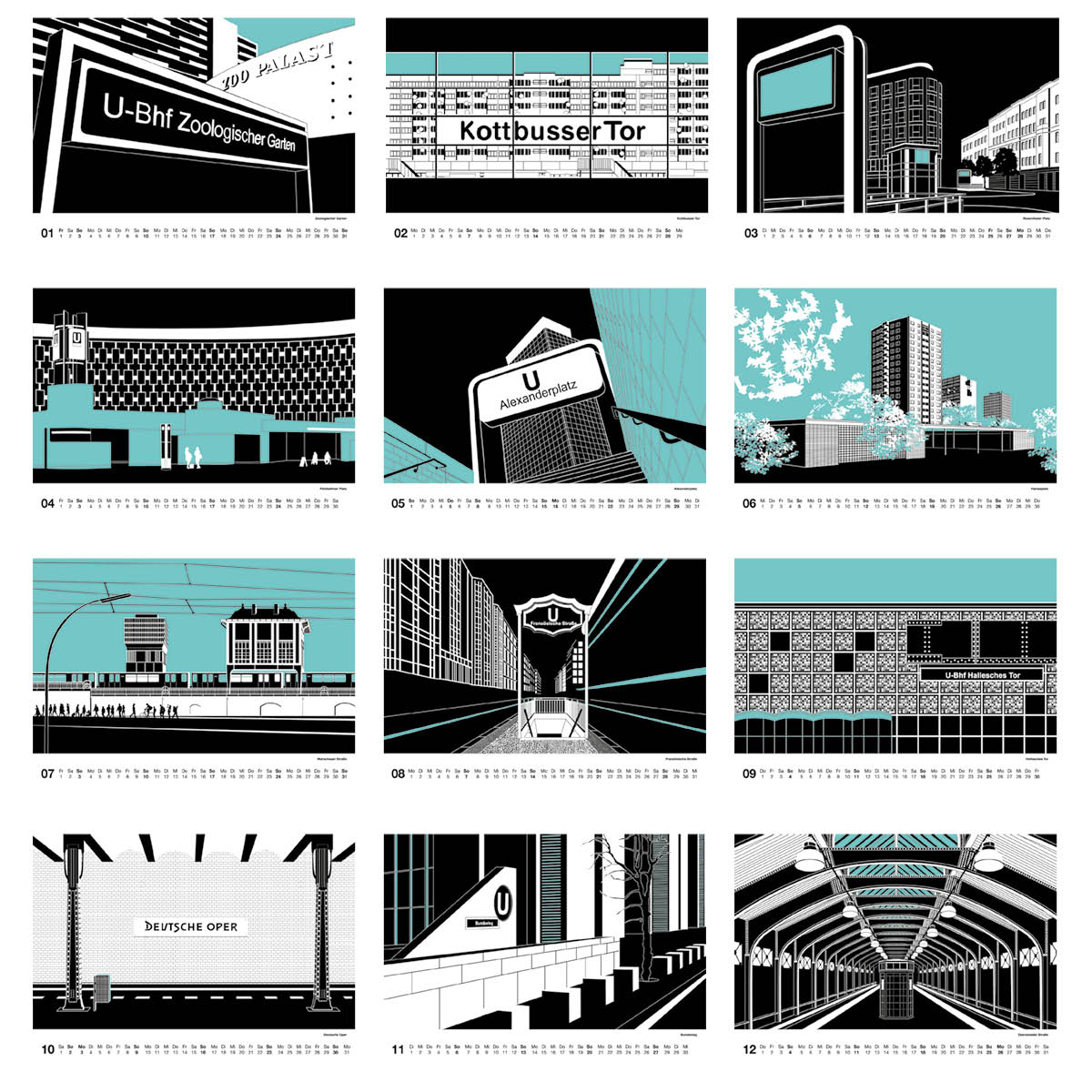 m Januar sorgt eine dynamische Grafik vom U-Bahnhof Zoologischer Garten für einen guten Start ins neue Jahr. Im Februar folgt ein Blick auf die Wohnbebauung am Kottbusser Tor mit ihren vielen Satellitenschüsseln. Rosenthaler Platz und Fehrbelliner Platz sind im März und April zu sehen.