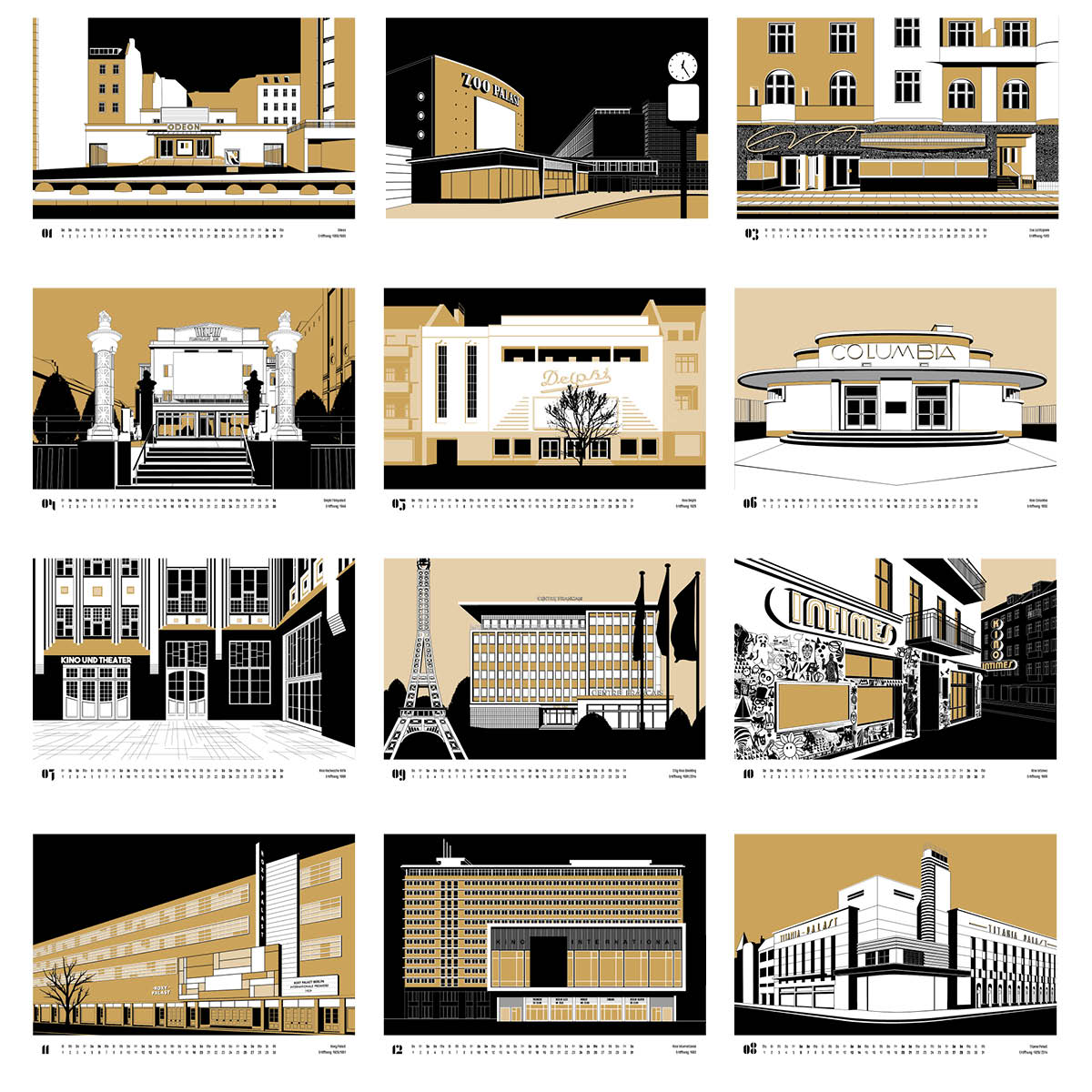 Grosses Kino Berlin – im Wandkalender 2022: Kino Berlin zeigen wir Illustrationen zu 12 Berliner Kinos.
