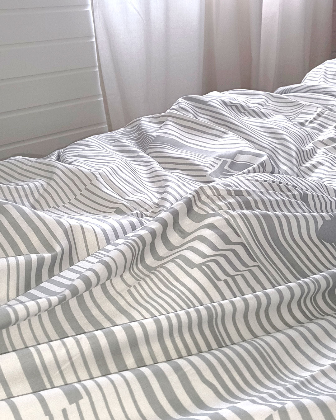 Das Bettwäsche-Set "die Horizontale" bringt mit seinem klaren, grau-weißen Streifenmuster eine beruhigende und moderne Ästhetik in jedes Schlafzimmer.