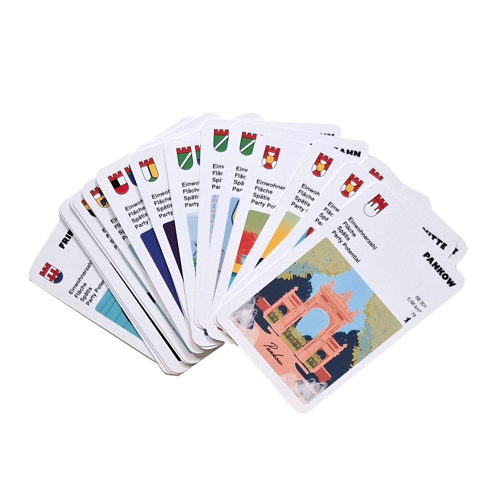 - Bezirke Quartett – Spielerisch die Berliner Bezirke kennenlernen und vergleichen. Welcher Bezirk hat die meisten Einwohner? Wo gibt es die meisten Grünflächen? Ein unterhaltsames Kartenspiel für Jung und Alt!