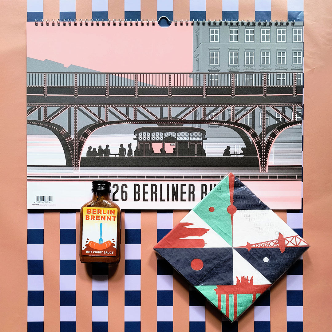 Hochwertige Berlin-Produkte mit Currywurst- und Imbissbuden-Motiven