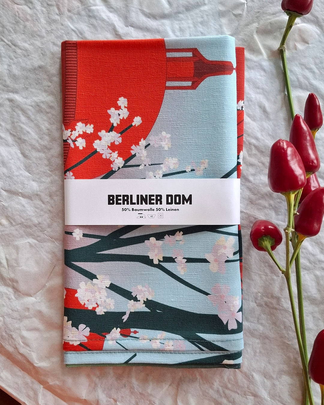 Ein hochwertiges und nützliches Geschenk aus Berlin – das Küchentuch mit dem frühlingshaften Berliner Dom. Das saugfähige Halbleinentuch von s.wert punktet durch das ausgefallene Design und hervorragende Qualität.