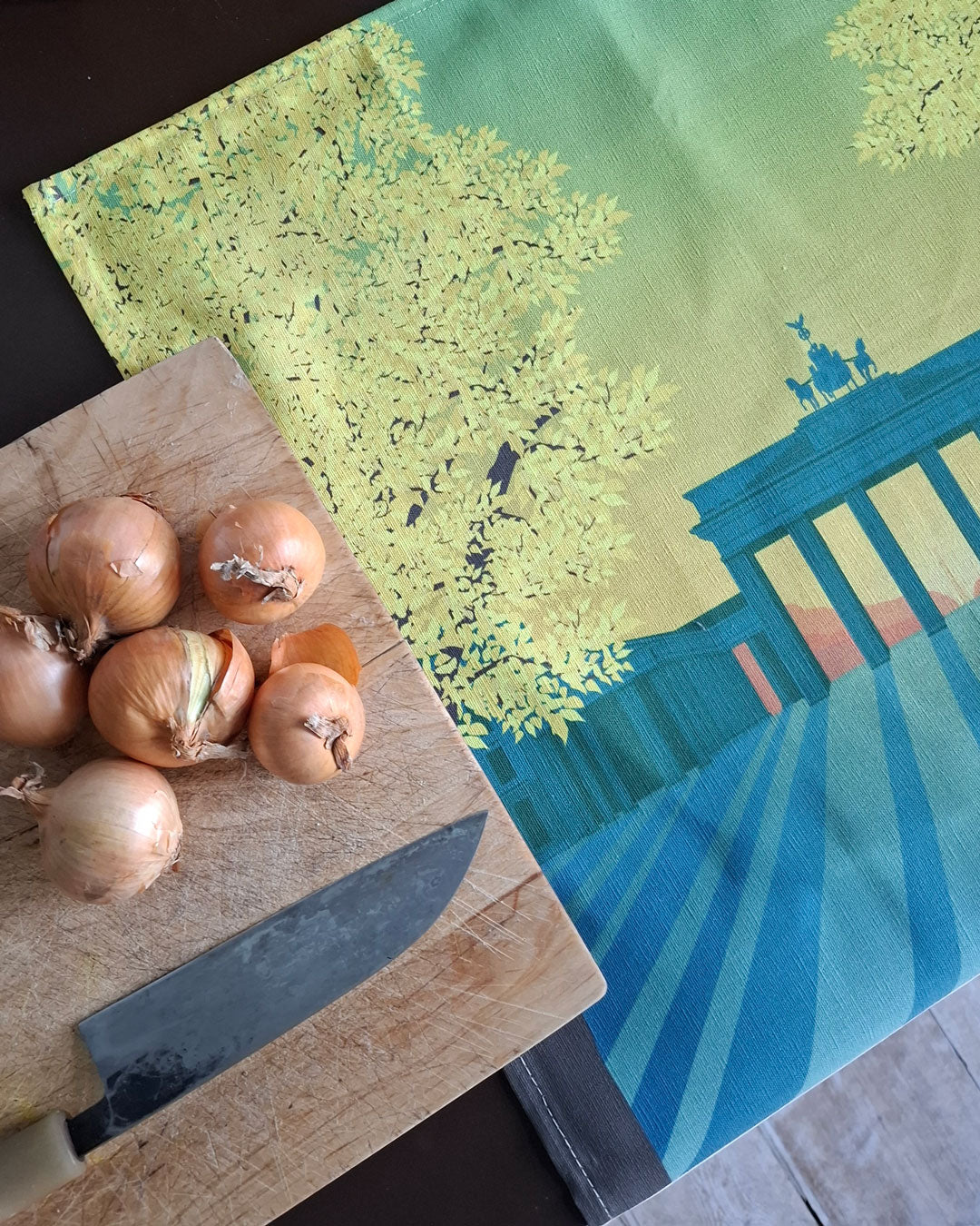 Das Geschirrtuch zeigt das Brandenburger Tor, eines der bekanntesten Wahrzeichen Berlins. Es verbindet ästhetisches Design mit praktischer Funktion, ideal für alle, die Berlin lieben.