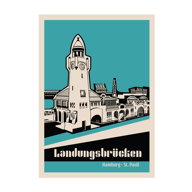 Hamburg Poster mit Landungsbrücken Motiv im Retro-Stil. Die St. Pauli-Landungsbrücken sind ein sehenswertes Gebäudeensemble entlang der Elbe. Gezeichnet mit klaren schwarzen Linien strahlt unser Poster im blaugrün des Meeres und unterstreicht gleichzeitig die Bedeutung dieses Knotenpunkts im Handel und der Schiffart in der Elbmetropole Hamburg.