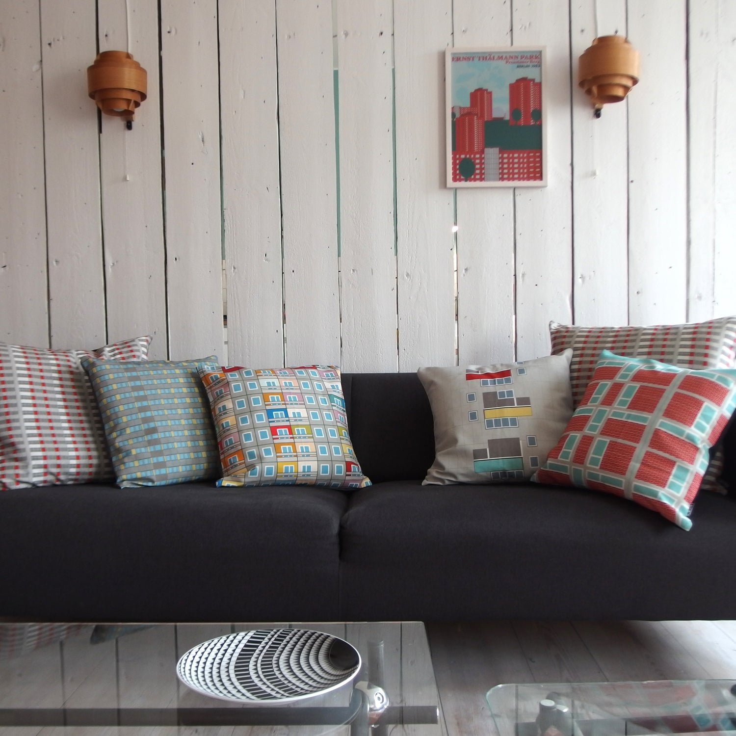 Fassadenkissen Unsere Kissen sind von neuen und alten Fassaden der Hauptstadt inspiriert, aber auch die ikonischen Berliner U-Bahn Stationen und Straßenleuchten spielen eine Rolle.