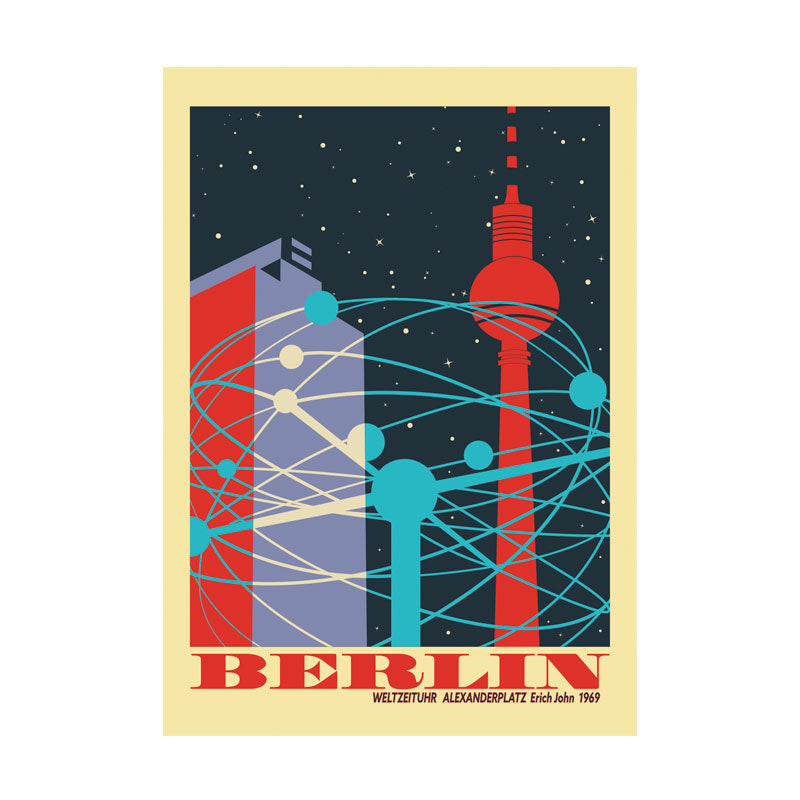 Schick einen Gruß aus Berlin mit unserer Weltzeituhr-Postkarte mit Retro-Twist.